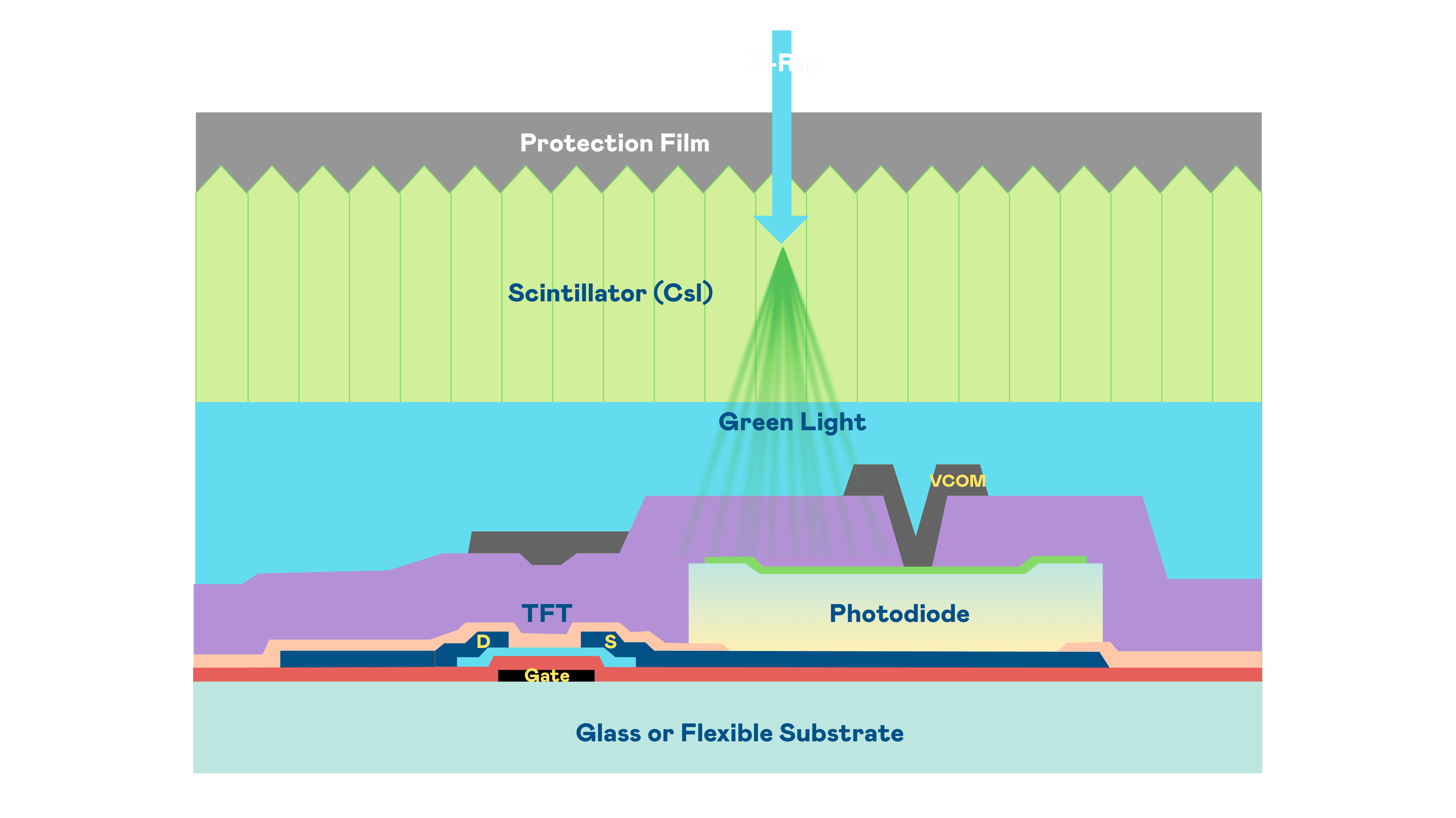 william威廉中文官网的X光影像感测阵列使用薄膜电晶体 (TFT) 作为每个像素的读取开关,,搭配光电二极体(Photodiode)的光电转换元件,,,,用以感测X光影像讯号。。